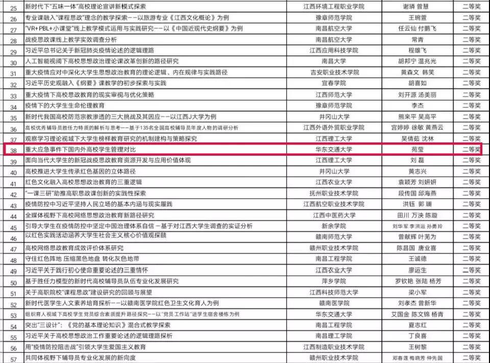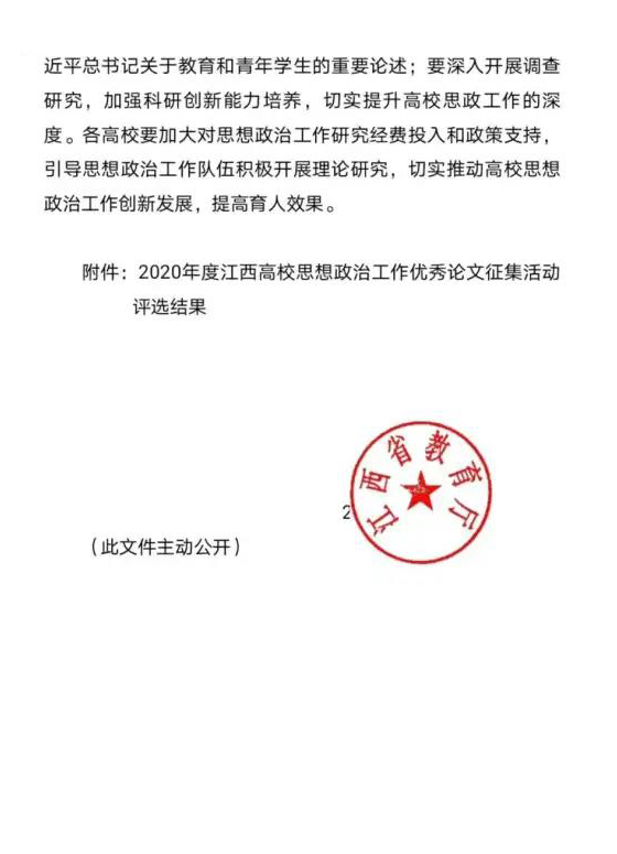9月14日,江西省教育厅开展了2020年度江西省高校思想政治工作优秀论文征集活动。经各高校推荐、专家评审、公示等环节,共评选出优秀论文100篇,其中:一等奖24篇、二等奖33篇、三等奖43篇。其中公司苑莹老师的“重大应急事件下国内外高校员工管理对比”论文荣获2020年度江西高校思想政治工作优秀论文二等奖。