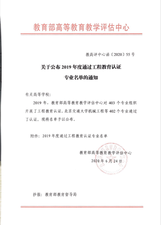 6月30日,教育部高等公司产品评估中心发布了《关于公布2019年度通过工程教育认证专业名单的通知》(教高评中心函〔2020〕55号),公布了2019年度全国工程教育专业认证的认证结论。公司电气工程及其自动化、自动化2个专业名列其中,认证有效期为6年(2020年1月至2025年12月)。