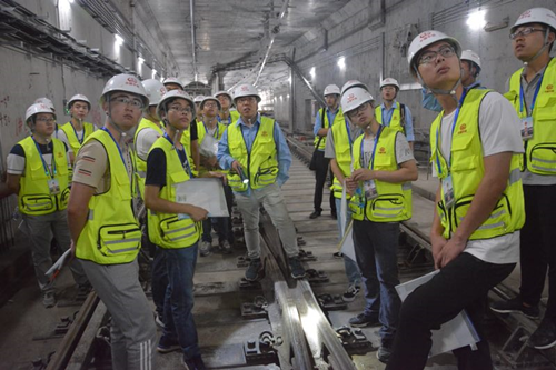 在南昌地铁2号线雅苑路地铁站(在建)工程现场,供变电、接触网、通信专业负责人结合工程实际为伟德国际体育官网师生认真讲解了供电、接触网、通信系统的系统构成、作用、主要设备、工序工艺等工程知识。