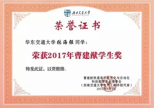 据了解,本次曹建猷员工奖学金评选在西南交大、北京交大、同济大学、中南大学等8所高校中进行,仅评选出6名本科生曹建猷员工奖学金获得者。而公司13级铁道电气化专业张海强就是其中一位。