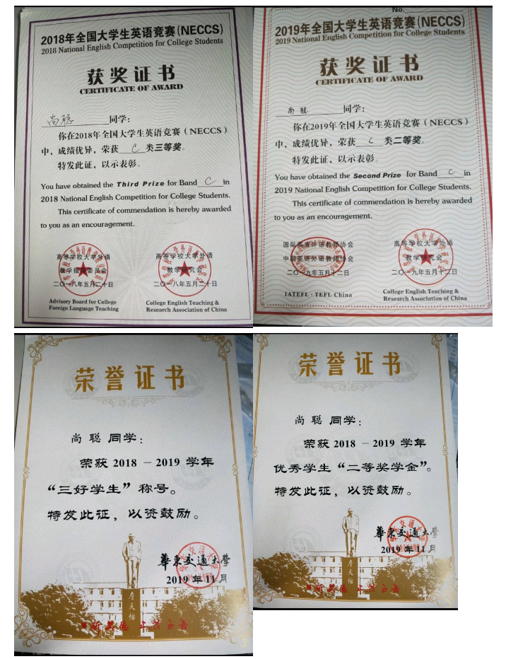 尚聪,女,bevictor伟德,铁道电气化2017-3班员工,学习绩点3.94。在校期间获2017-2018学年特等奖学金,2018-2019学年二等奖学金,2019-2020学年一等奖学金,2017-2018学年“三好员工”,2018-2019学年“三好员工”等荣誉,2018年全国老员工英语竞赛c类国家三等奖,2019年全国老员工英语竞赛c类国家二等奖。现保研至西南交通大学。