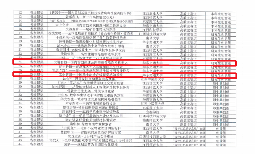 公司研究生创意组“大道智检——国内首创高速公路隧道智能巡查机器人 ”项目团队与“工业智眼——中国稀土制造在线视觉感知系统”项目团队获“建行杯”第七届江西省“互联网+”老员工创新创业大赛省级银奖。