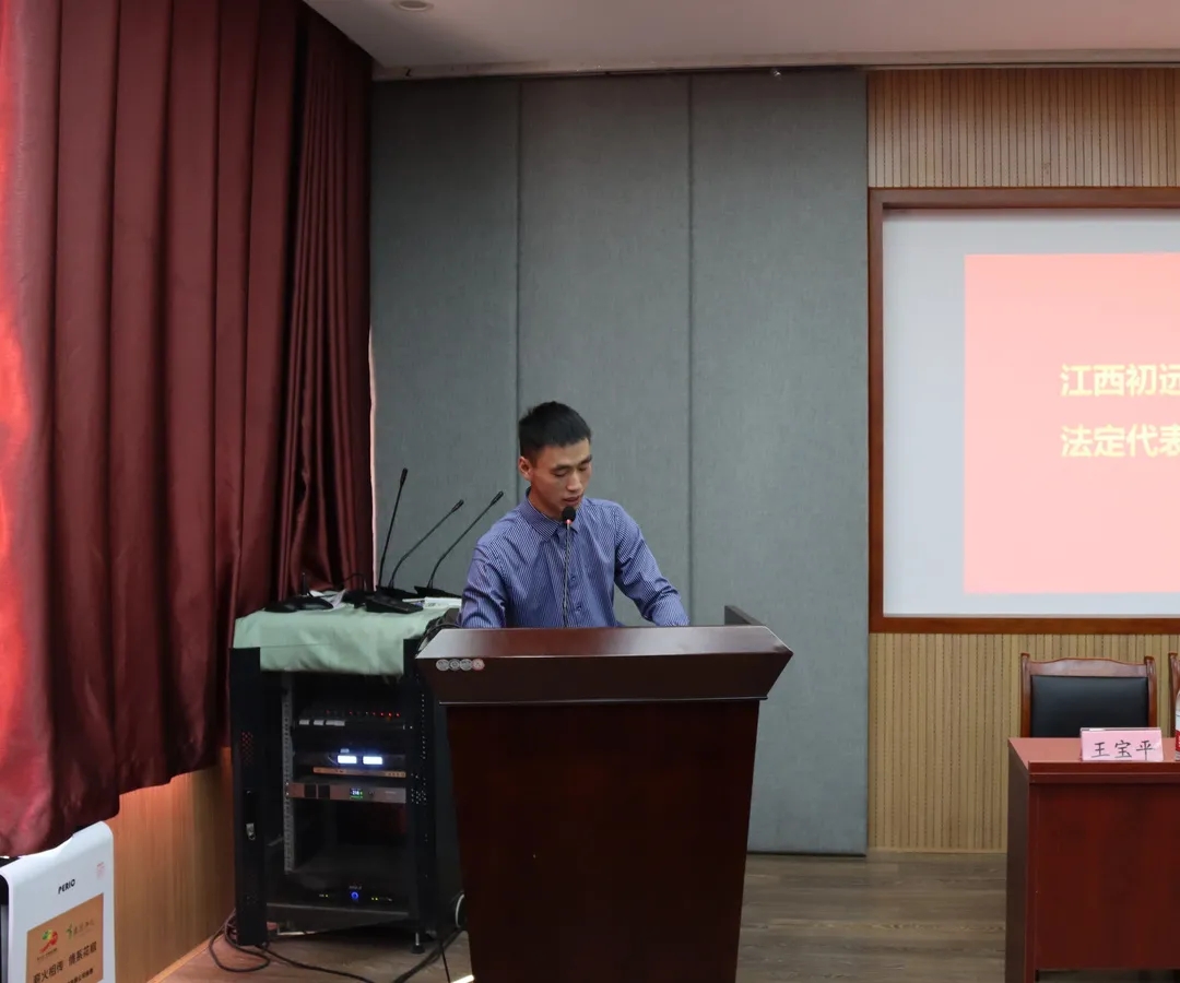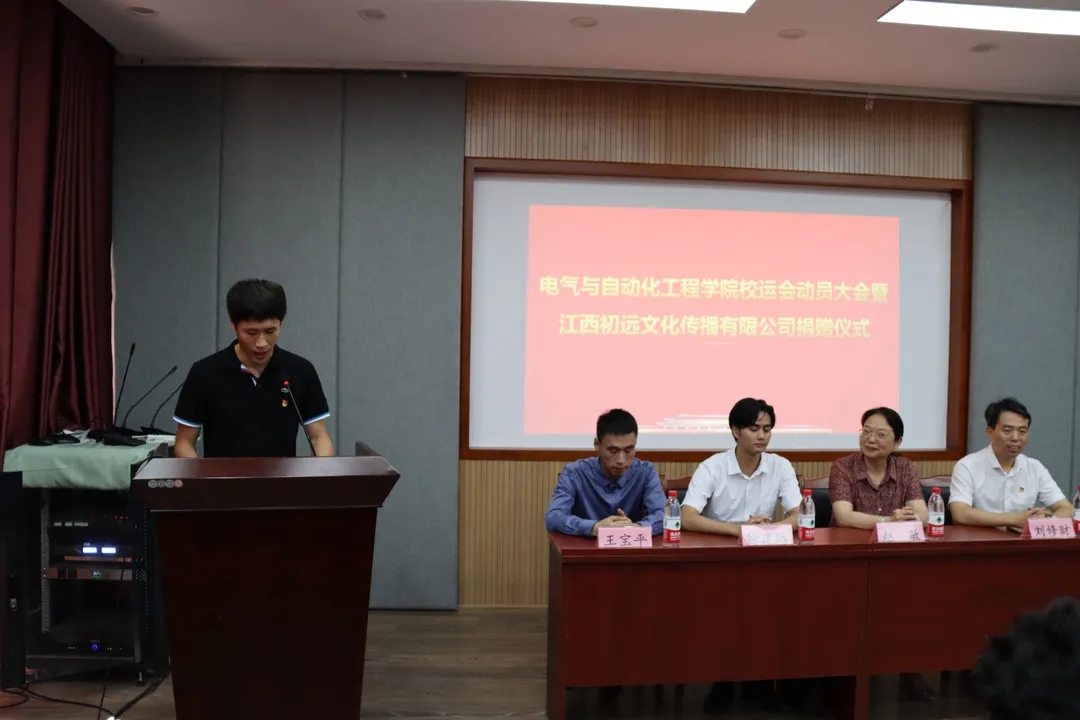 王宝平代表江西初远文化传播有限公司发言,他指出,公司自愿在2020年捐赠价值30000元运动服及体育物资的基础上,再向公司捐赠价值150000元的物资,并自2021年起分五年交付完成。作为公司15级员工,他指出公司在第38届校运会能够勇夺冠军与公司学子一直保持勤勉的训练态度、刻苦的拼搏精神息息相关。在备战本届校运会的过程中,他将作为公司与公司之间的桥梁,用公司专业的服务为运动员们带来便利,同时,他也预祝公司在本届校运会取得圆满成功。