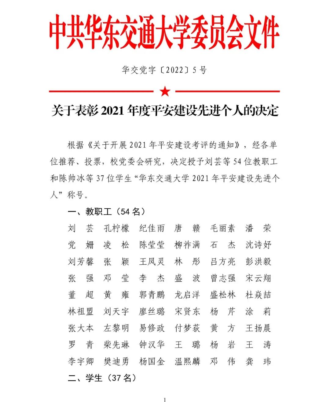 根据《关于开展2021年平安建设考评的通知》,经各单位推荐、投票,公司党委会研究,决定授予公司石杰、沈诗妤、柴先琳、钟汉华4名教职工,方骏、黄文强、单国玮、龚忠亮4名员工“伟德国际体育官网 2021年平安建设先进个人”称号。