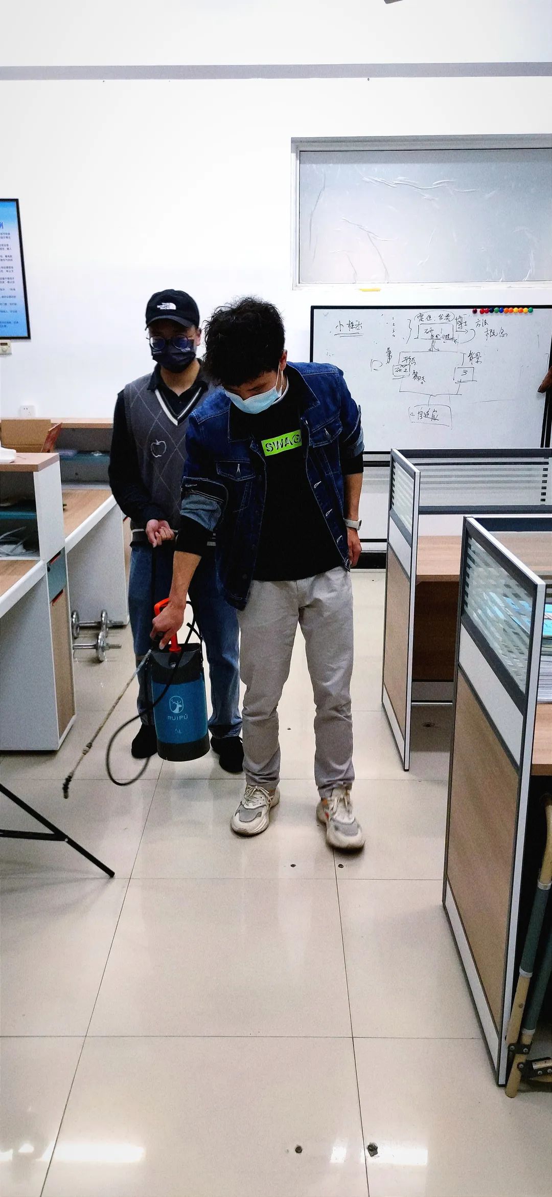 结合疫情防控工作具体要求,公司志愿者按照要求,配备消毒液对研究生工作室进行全面细致的消毒消杀。消杀过程中,志愿者严格按照操作规范,确保消毒杀菌工作落实落地。