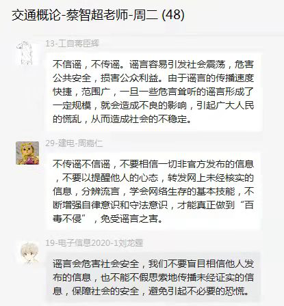 电牵教工党支部书记蔡智超老师,结合热点“3.21东航空难”,在《交通概论》线上教学中就“交通安全”知识点开展课程思政,挖掘了“不传谣、不信谣”思政元素,强调互联网不是法外之地,同学们要做遵纪守法的好公民。