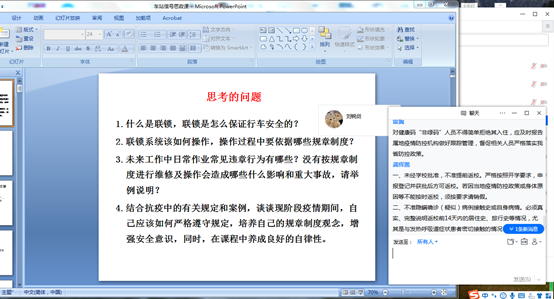 负责《车站信号自动控制》课程的老师在线上教学中,巧妙将思政元素融入课程,以图片、视频等形式对课程进行分析和讲解,通过学习联锁的内涵以及联锁系统如何保障行车安全,提高员工的安全管理意识,同时老师要求员工们要严格遵守规章制度、按章操作,引导员工树立安全意识,塑造制度观念。