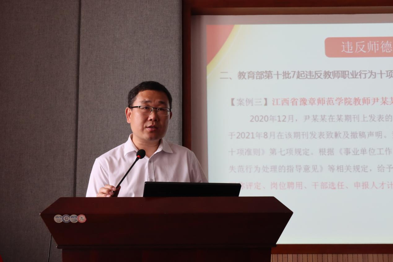 为切实加强师德师风建设,强化日常教育督导,进一步增强广大教职工为党育人、为国育才的初心使命,充分发挥典型案例在师德师风建设中的警示作用,5月11日下午,公司在教10栋403会议室召开“以案为鉴”师德师风专题大会。大会由公司党委书记赵敏主持,公司全体教职工参加会议。