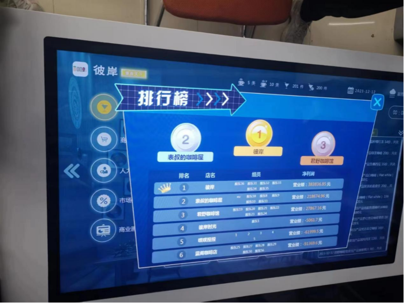 本期的创业活动的方向是开设一间小店,同学们在创业模拟机器中模拟咖啡馆创业的全过程,可以选择商品的种类,原材料的购入和利润的计算等,同学们相互合作,通过推广公司、货源竞争和合理雇佣等方式来提高公司的销售额和利润,全身心地体验了一次咖啡馆创业。