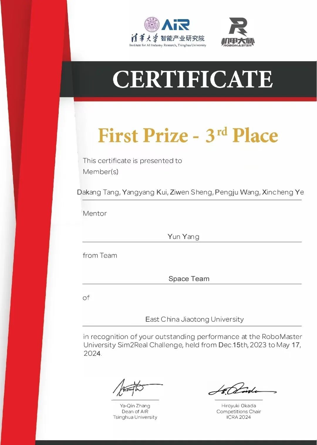 近日,ICRA 2024 RoboMaster机甲大师高校Sim2Real挑战赛(RoboMaster University Sim2Real Challenge,简称RMUS)总决赛在北京顺利闭幕。伟德国际体育官网bevictor伟德电子创新基地的参赛队伍,包括唐大康、隗洋洋、盛子文、王鹏举、叶新铖五位同学,在杨云老师的带领下,与来自天津大学、中国科公司大学、哈尔滨工业大学(深圳)、东北大学、北京理工大学、等117所名校学子展开激烈角逐,首次参赛表现优异荣获第三名,获得本次竞赛的一等奖。