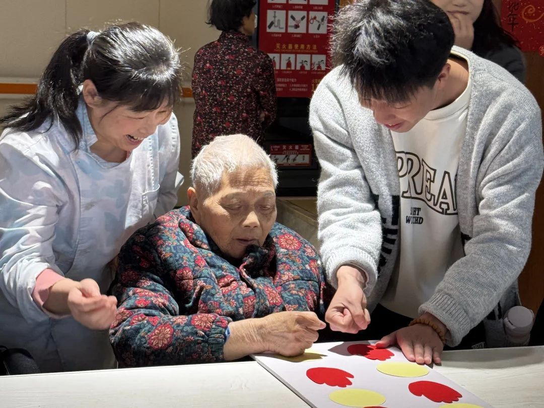 B组在五楼养老院的活动室内,学员们开展了一系列简单有趣的互动游戏,像色彩苍蝇拍、左手方右手圆、拉纸杯等游戏趣味横生。在游戏过程中,学员们还陪着老人畅谈往昔,静静聆听岁月的絮语。与此同时,文工团成员们也加入进来,带着老人们一起唱歌。现场充满欢声笑语,大家的心也在这欢乐氛围中越靠越近。