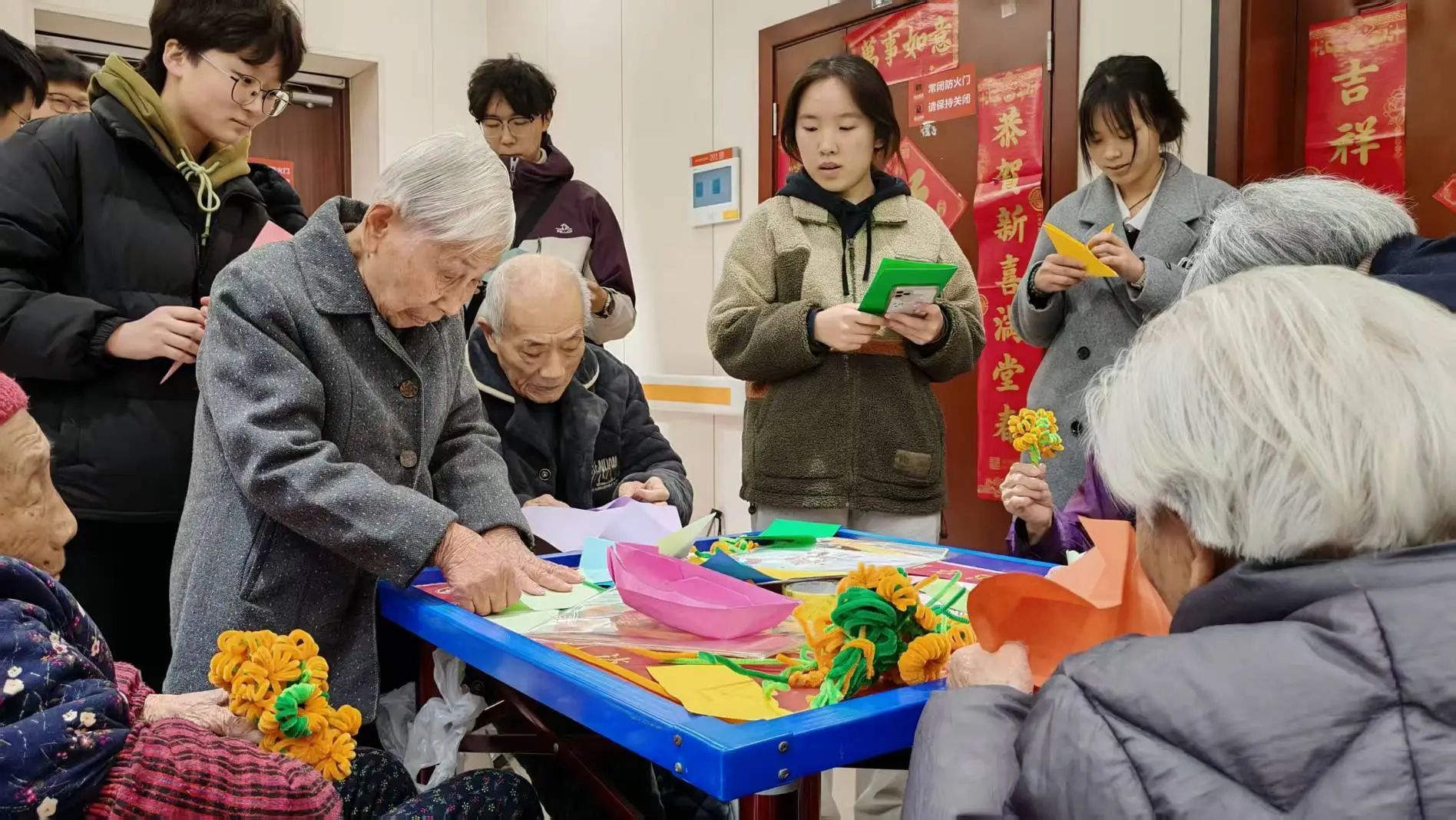 A组在二楼教老人们用扭扭棒弯出花朵。学员们耐心细致地讲解,让原本一脸迷茫的老人们逐渐沉迷其中,越来越多的老人参与到这项手工活动中来。在活动过程中,老人们充分发挥想象力,把一朵朵小花缠成花束,还运用彩纸折出颜色艳丽的小金鱼,以手工的形式展现出他们细腻的心思,绽放出比作品本身更珍贵的生命力。
