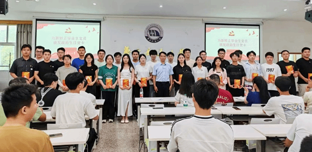 会上,刘修财同志为新转正的毕业生党员过政治生日,颁发政治生日贺卡,并合影留念。