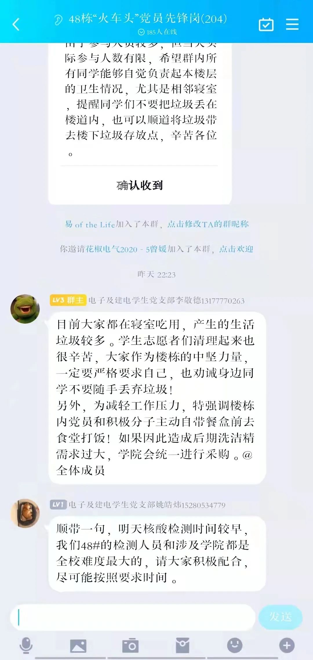为了保证宿舍的良好卫生环境,在宿舍楼的垃圾无法及时清理的情况下,身为党员,我们进行了楼栋卫生清理志愿活动,在中午和晚上打包清理堆积的垃圾,打扫楼道,保证了宿舍的良好卫生环境。作为一名员工党员,我们要敢于担当,有责任,在志愿活动和社会实践中完善自己,提升自己,坚决打好防疫攻坚战,贡献青春力量。