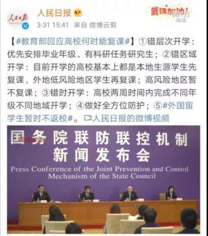 教育部3月31日表示,高校复课第一是要错层次开学,错层次开学首先优先安排的就是毕业年级以及有科研任务的研究生,第二是要错区域开学,高风险地区的员工先暂时不复课。各地高校开学是由各地、各省市区和各高校一起根据疫情形势的研判和员工的具体构成来确定开学和复学时间。第三是要错时复课,每一个高校基本安排在两周时间内完成不同年级、不同地域的员工返校。