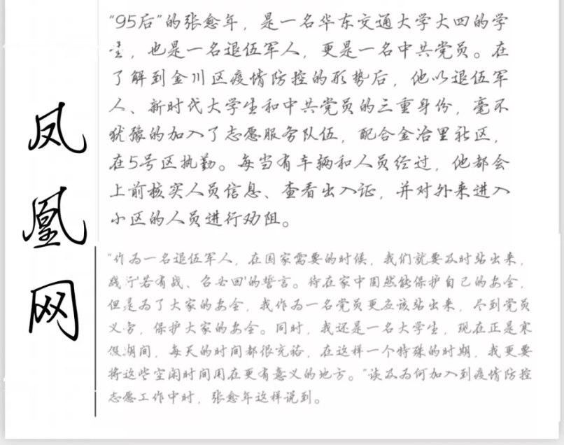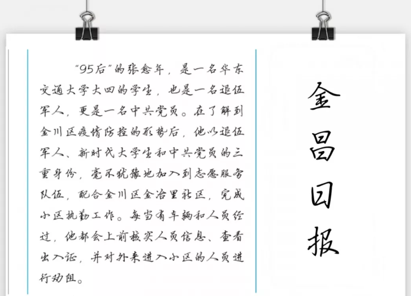 自疫情暴发以来,作为退伍军人的张愈年响应《新冠肺炎疫情志愿者倡议书》,发扬军人本色,践行“若有战、召必回”的誓言,积极投身疫情防控志愿服务工作。凤凰网、金昌日报对张愈年的事迹进行了报道。