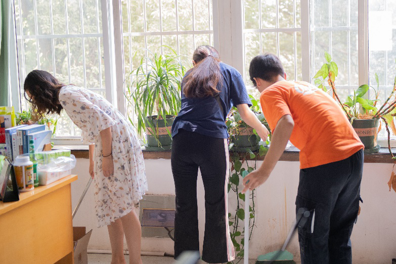 在打扫卫生过程中,每一位同志都十分认真,一丝不苟地打扫着每一个角落,扫地、拖地、擦拭、换水成为了他们行动的指南,只为让这里的老师、同学们可以享受到更好的工作和学习条件。