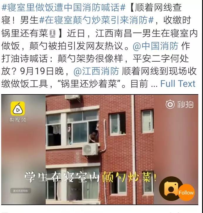 而在我们的身边,就在2019年9月19日晚,江西南昌一员工在寝室做饭,颠勺被拍引网友热议,@江西消防 到现场收缴做饭工具,一进门发现锅里还炒着菜。目前,公司通报称老师已对该同学进行了思想教育,该同学已认识到寝室安全的重要性。