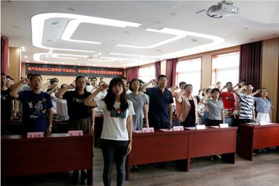 接下来由党教中心主任陈雨琪领誓入党誓词,全体人员举起右手,紧紧握拳,又一次庄严起誓,重温入党的决心和信念。