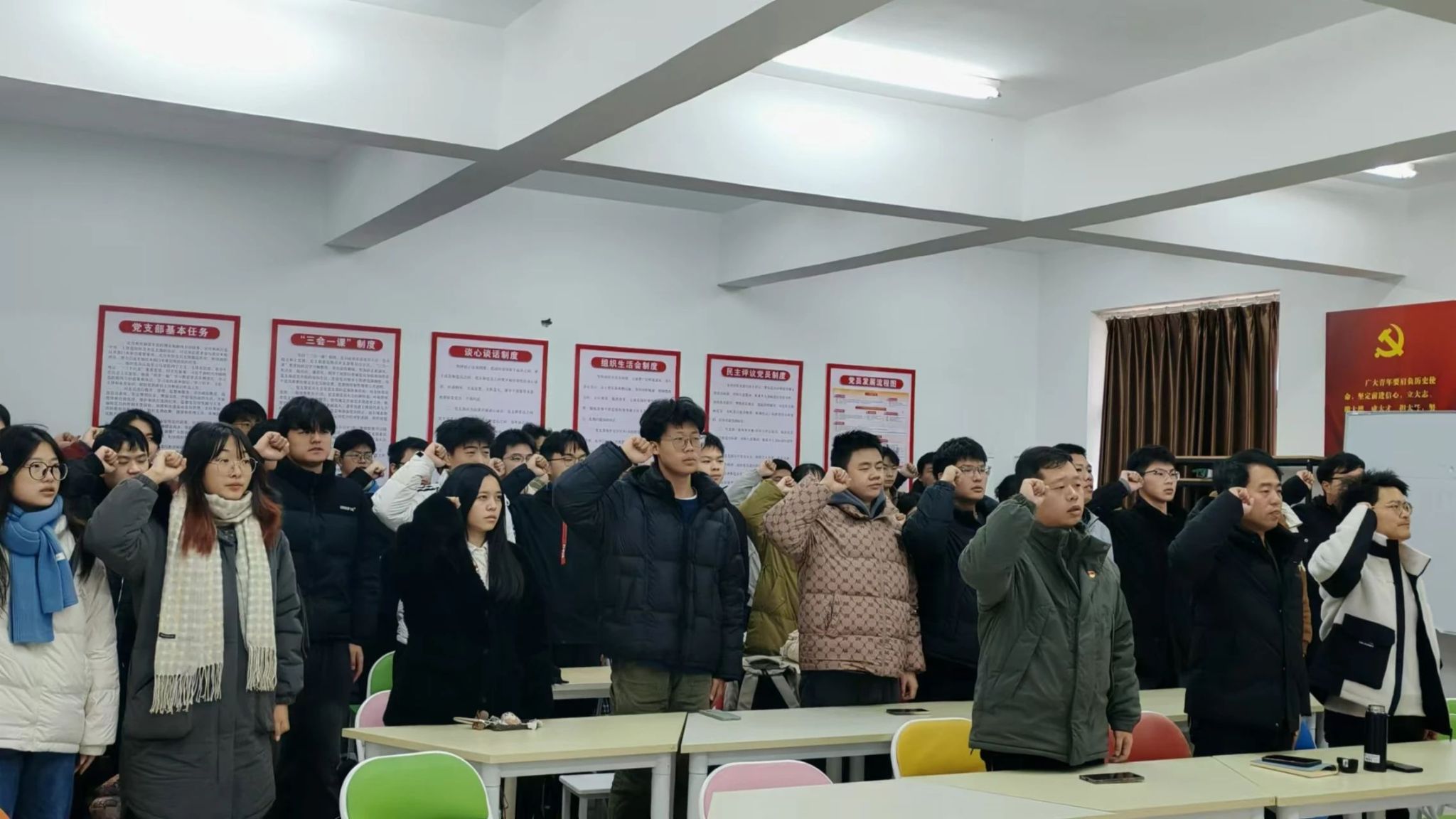 在刘佳老师的领誓下,全体预备党员右手握拳,面向党旗,齐声念出入党誓词:“我志愿加入中国共产党,拥护党的纲领……为共产主义事业奋斗终身,随时准备为党和人民牺牲一切,永不叛党。”字字铿锵、句句千钧,表达了他们对党的坚定信仰与绝对忠诚,宣告坚定不移追随党的领导,气氛热烈,振奋人心。