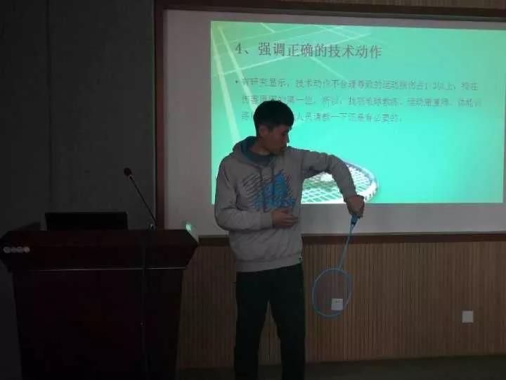 宁哲正从注意事项、训练方法、训练原则和练习模式四大方面着手,讲解如何合理运动、避免受伤及提高羽毛球运动技术水平等知识。对于业余爱好者,宁哲正给出定期体检、防寒保暖、适量运动、体能训练等建议。针对羽毛球运动中常发生的肌肉拉伤等运动损伤问题,宁哲正结合视频讲解,“运动前应进行充分的准备活动,如热身跑或者动态神经肌肉激活练习。打完球后则要以静力性拉伸为主,并按摩放松肌肉。”
