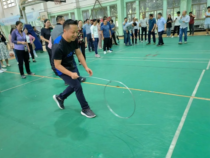 滚铁环接力环节,每队人按顺序排好队站立于起点,滚铁环跑到对面,绕小桶返回,然后其它队员依次接上,直至所有队员都跑完,按时间先后进行排名。老师们动作流畅敏捷,铁环在地上滚滚而行,快乐在围成的圆圈内不断传递,仿佛回到了童年时代,找回了那份纯真和快乐。