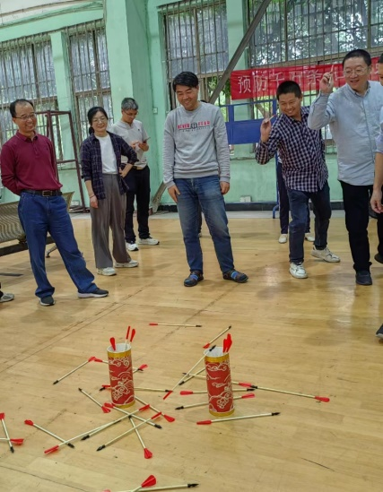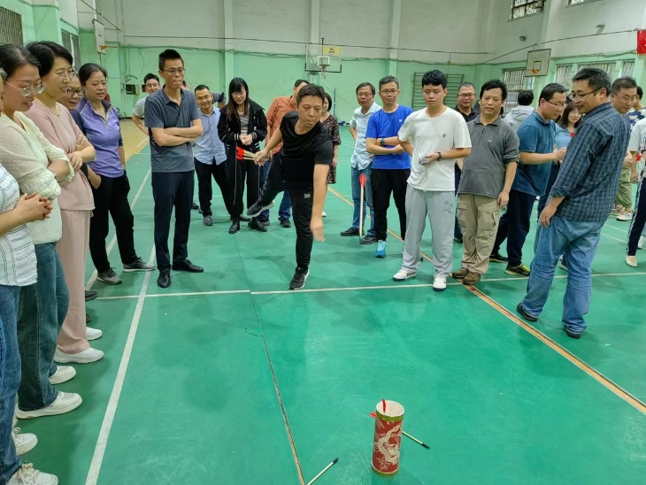 投壶环节,每队人按顺序排好队,每人10支箭,投入壶中,按10人总投入壶箭计数,多者胜。这考验的是目标感和投掷能力,“一、二、三……”激动的计数伴随着老师们手中羽毛箭的飞出,每一个命中都伴随着欢声笑语。