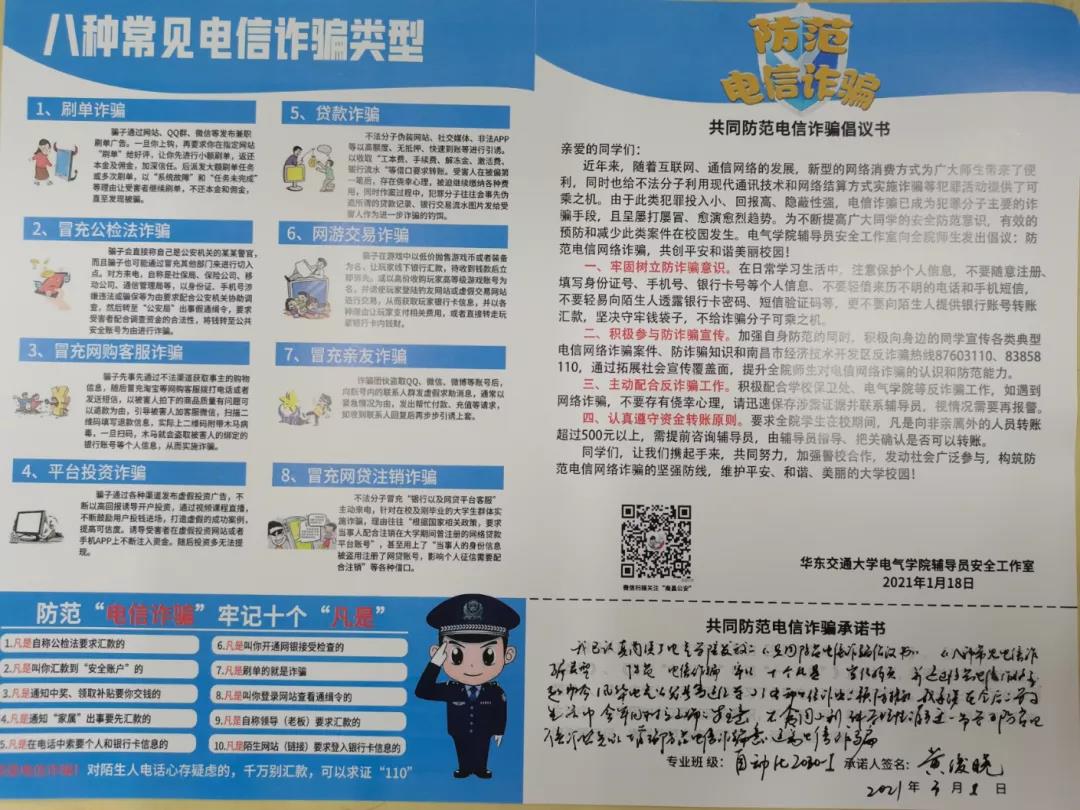 在《共同防范电信诈骗倡议书》里,公司辅导员安全工作办公室倡导大家牢固树立防诈骗意识、积极参与防诈骗宣传、主动配合防诈骗工作、认真遵守资金转账原则。不要贪图便宜,不要轻信陌生人,不要轻信来路不明的电话、信息、微信等消息,不向陌生人透露自己及家人的身份信息、存款、银行账号等,一旦上当受骗,应保存好相关证据,立即向辅导员报告,辅导员指导处理。同学们仔细阅读倡议书的每项内容,并签署《共同防范电信诈骗承诺书》。