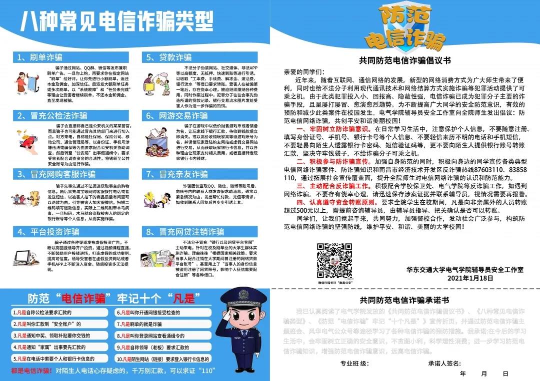 为进一步提高公司员工对电信诈骗的防范意识,有效预防电信诈骗案件发生。寒假期间,公司辅导员安全工作室周密部署,精心设计、制作了防范电信诈骗的宣传单折页。开学第一周全体辅导员组织召开防范电信网络诈骗主题班会,组织全院员工共同签下《共同防范电信诈骗承诺书》。