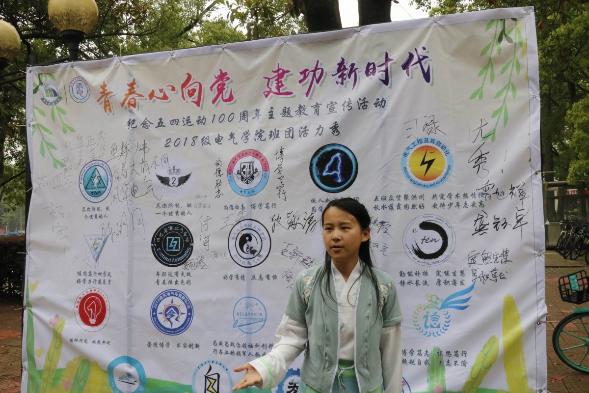 时间的主线来到时代的前沿,来自电气一班的平易容站在挂满班级徽章、写满班级口号的展板前,代表参加本次活动的所有班级和同学,带来以“童话破碎伊始”为题的“百年五四”演讲: