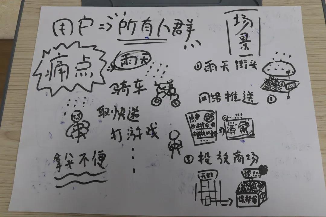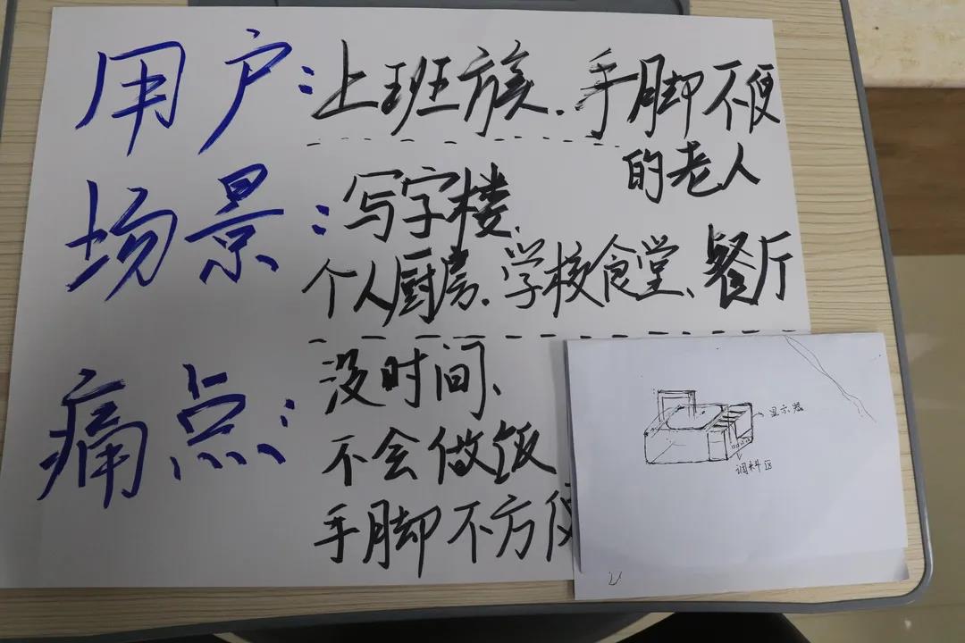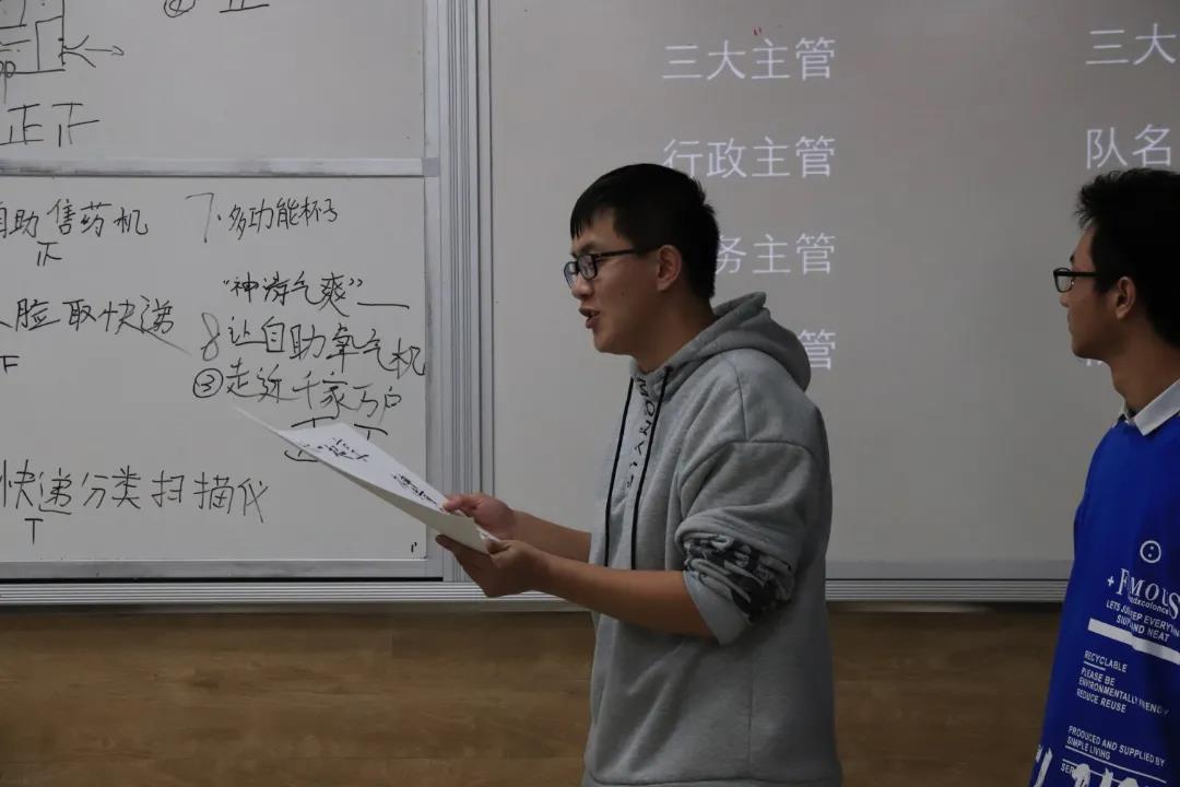活动开始,同学们结合生活提出项目,并用一分钟时间在台上展示各自项目的内容及价值,随后通过集体投票选出五个最具吸引力和发展前景的项目。紧接着,以选出的五个项目负责人为首,各自招募成员进行组队,在充分了解队员情况后分别任命行政、财务及技术主管等主要职位。最后,小组成员各抒己见,不断补充完善项目内容,在三分钟内通过小品、情景剧等表演形式进行创业模拟。经各小组投票评选,大厨小队的“点餐”式家用烹饪器荣获本次体验营最佳项目。