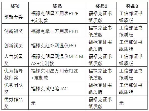 活动权益与要求:入选活动的团队可免费在福禄克提供的福禄克数字万用表、数字钳形表、绝缘电阻测试仪、红外测温仪、非接触电压电流测试仪、红外热像万用表、高精度万用表套装、汽车专用万用表、坚固型高精度万用表(具体参考上述产品列表)等产品中进行选择和使用1个月时间,将产品用于实验项目或作品创作。使用结束及时按要求提交作品视频及说明书(视频格式及说明书模板详情请见附件1),组委会将从作品中选择优秀视频宣传展示,同时对本次活动设置奖品和奖项。