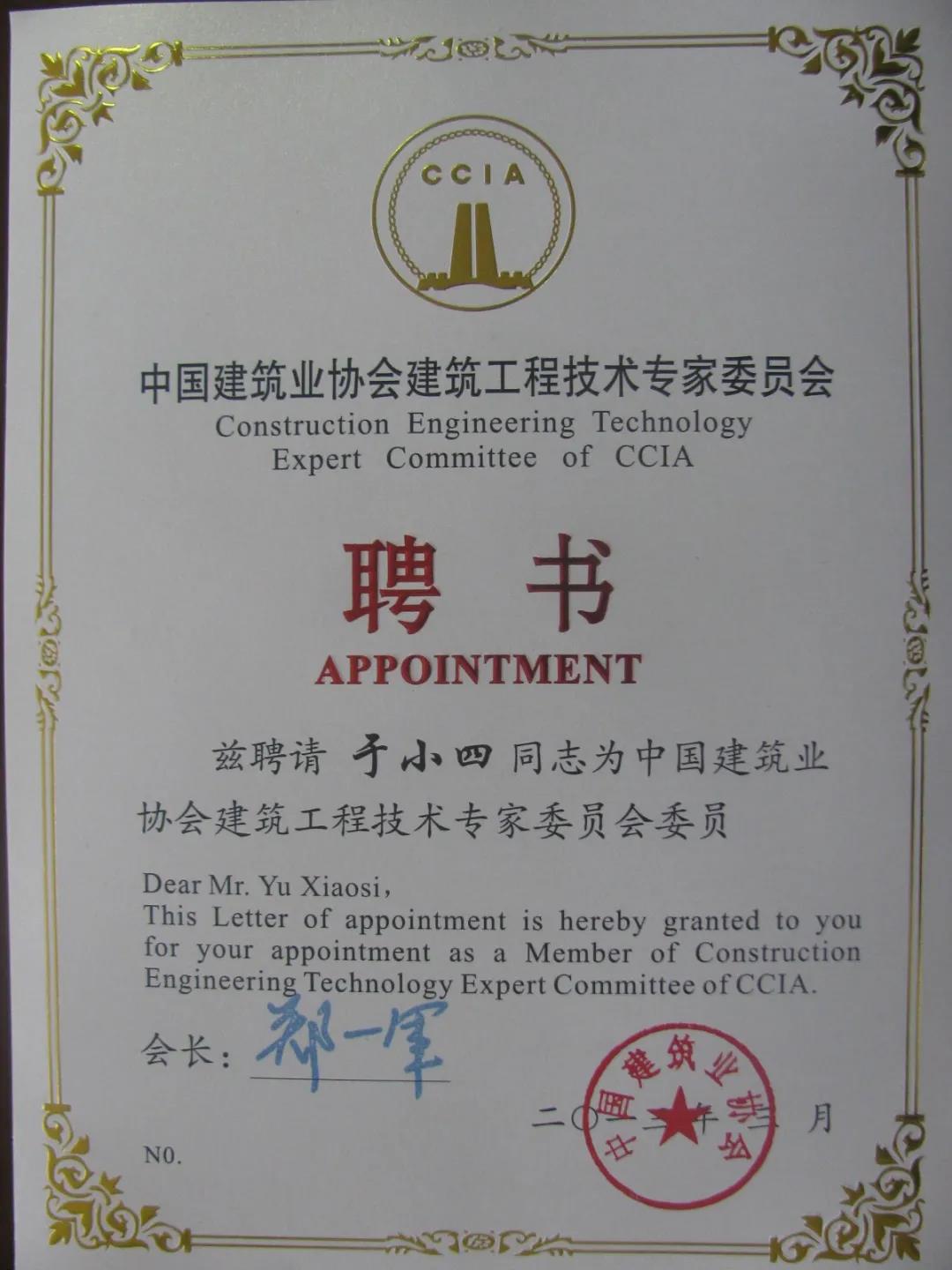 当选享受国务院特殊津贴专家;受聘于清华大学专家委员会专家;深圳地铁技术顾问;中国中铁专家、中国建筑业协会建筑工程技术专家、中国施工企业管理协会科技专家。同时被五所高等院校聘请为客座教授、许昌智能继电器股份有限公司等三家上市企业聘为特别顾问。