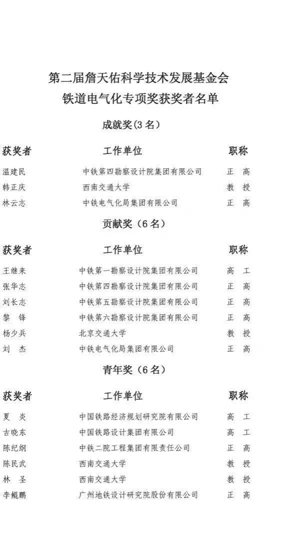 年度詹天佑「铁道电气化」专项奖(第二届)获奖者名单公布,公司