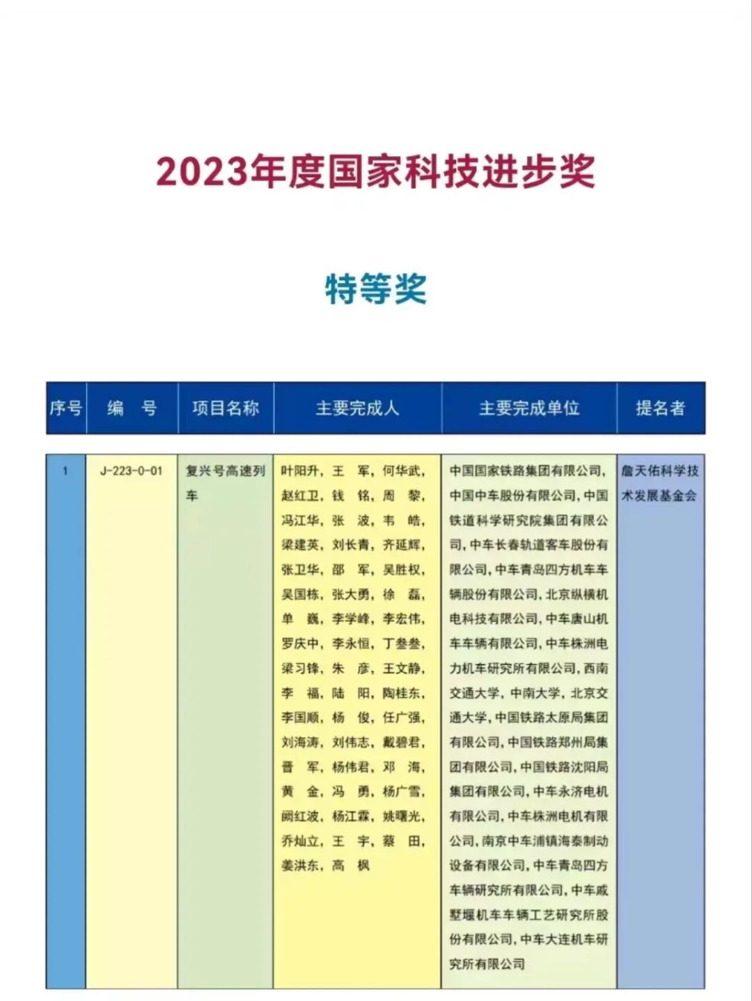 主要完成单位:中国国家铁路集团有限公司,中国中车股份有限公司,中国铁道科学研究院集团有限公司,中车长春轨道客车股份有限公司,中车青岛四方机车车辆股份有限公司,北京纵横机电科技有限公司,中车唐山机车车辆有限公司,中车株洲电力机车研究所有限公司,西南交通大学,中南大学,北京交通大学,中国铁路太原局集团有限公司,中国铁路郑州局集团有限公司,中国铁路沈阳局集团有限公司,中车永济电机有限公司,中车株洲电机有限公司,南京中车浦镇海泰制动设备有限公司,中车青岛四方车辆研究所有限公司,中车戚墅堰机车车辆工艺研究所股份有限公司,中车大连机车研究所有限公司